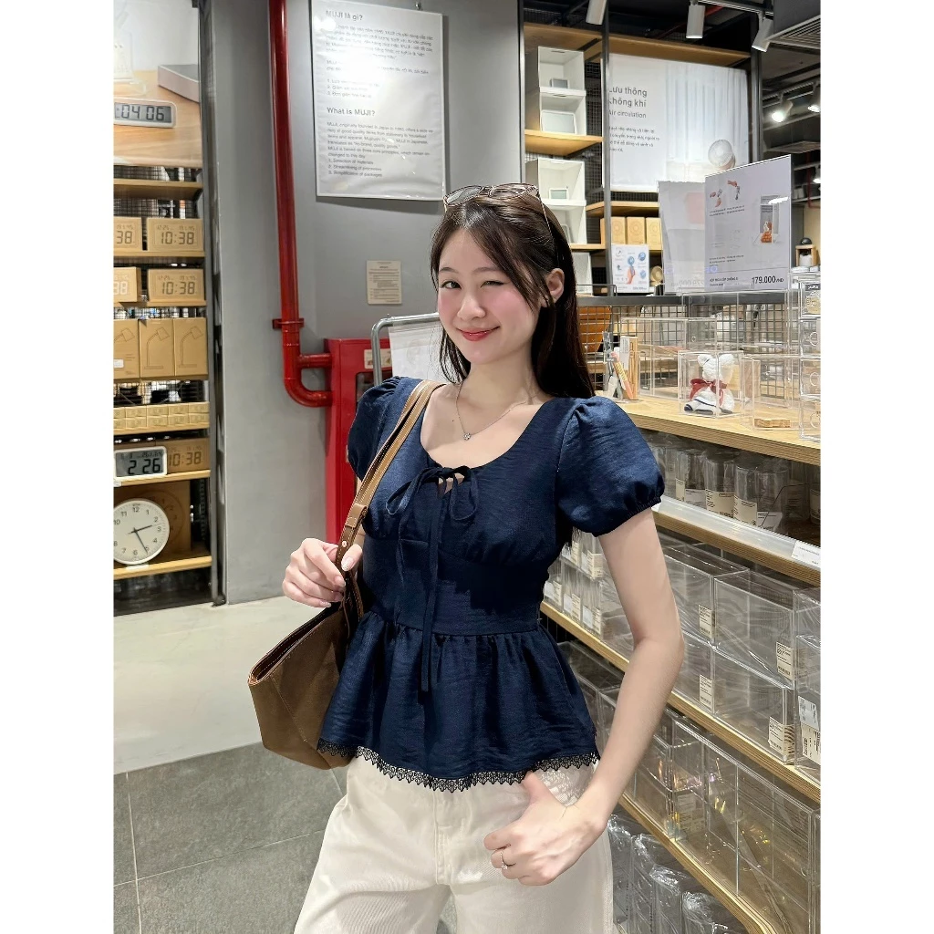 Áo Kiểu Nơ Buộc Bo Eo Tay Bồng Pha Ren A3117